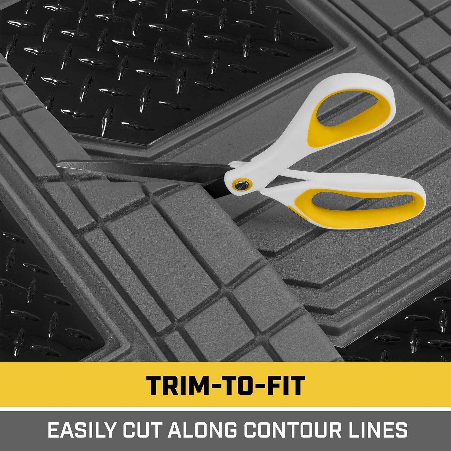 Protect and enhance your vehicle’s interior with the BDK CAT® Heavy Duty All-Weather Tough Rubber Car Floor Mats. Perfect for cars, trucks, SUVs, vans, and sedans, this 4-piece set includes front and rear floor mats along with a universal trim-to-fit trunk cargo mat liner for complete all-weather protection. Designed to handle mud, dirt, spills, and everyday wear, these durable rubber mats safeguard your vehicle’s floors while adding a sleek metallic design for a modern touch.